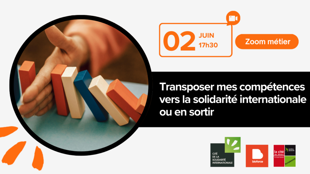 La Cité de la Solidarité Internationale, en partenariat avec Bioforce et la Cité des Métiers, vous invite à participer à son prochain webinaire : « Transposer mes compétences vers la Solidarité Internationale ou à l’inverse en sortir »