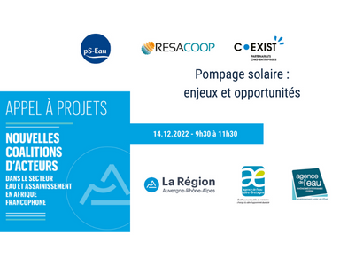Supports de présentation du webinaire « Pompage Solaire : enjeux et opportunités » organisé le 14/12/2022 par le pS Eau, Resacoop et COEXIST dans le cadre de l’animation de l’Appel à Projet Nouvelles Coalition d’acteurs porté par la Région Auvergne Rhône Alpes et les Agences de l’Eau Rhône Méditerranée Corse et Loire Bretagne.